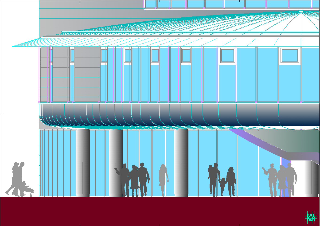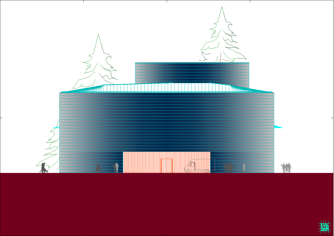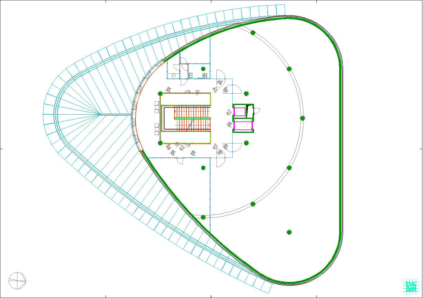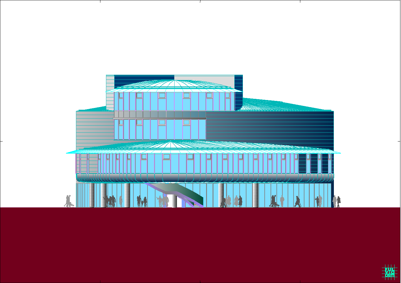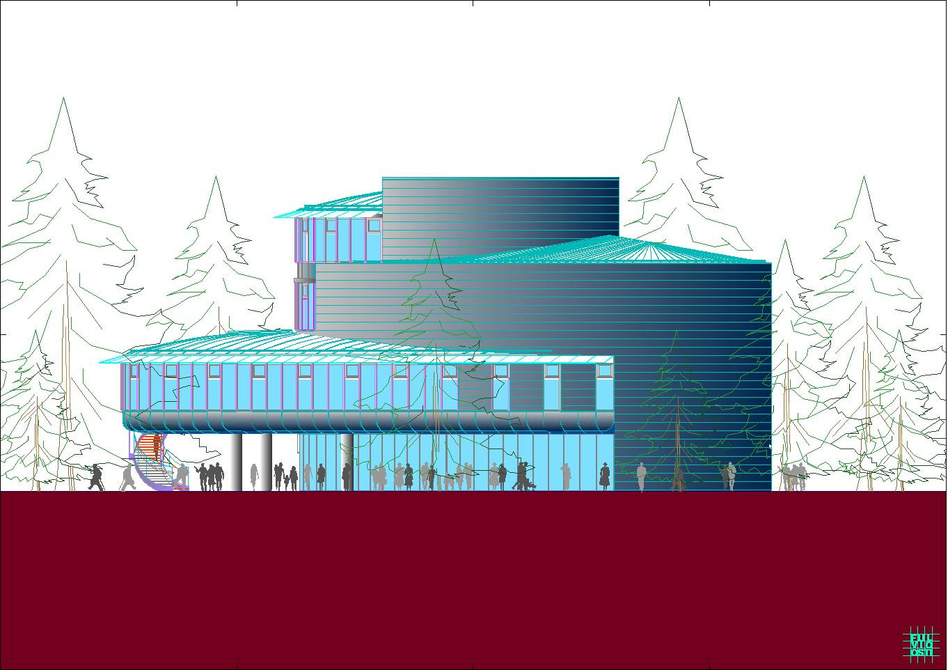 In questa "foresta" di immagini di ogni tipo, il progetto crede di individuare la propria ratio attraverso la lettura del sito, che è poco più di un trapezio allungato. Da questa situazione e da una riflessione sugli elementi ambientali, che sono proibitivi a dir poco, ne esce un modello a fasciature circolari, nell'intenzione di realizzare un involucro a forma "magmatica", come una calza di nylon che avvolge dei dischi circolari.