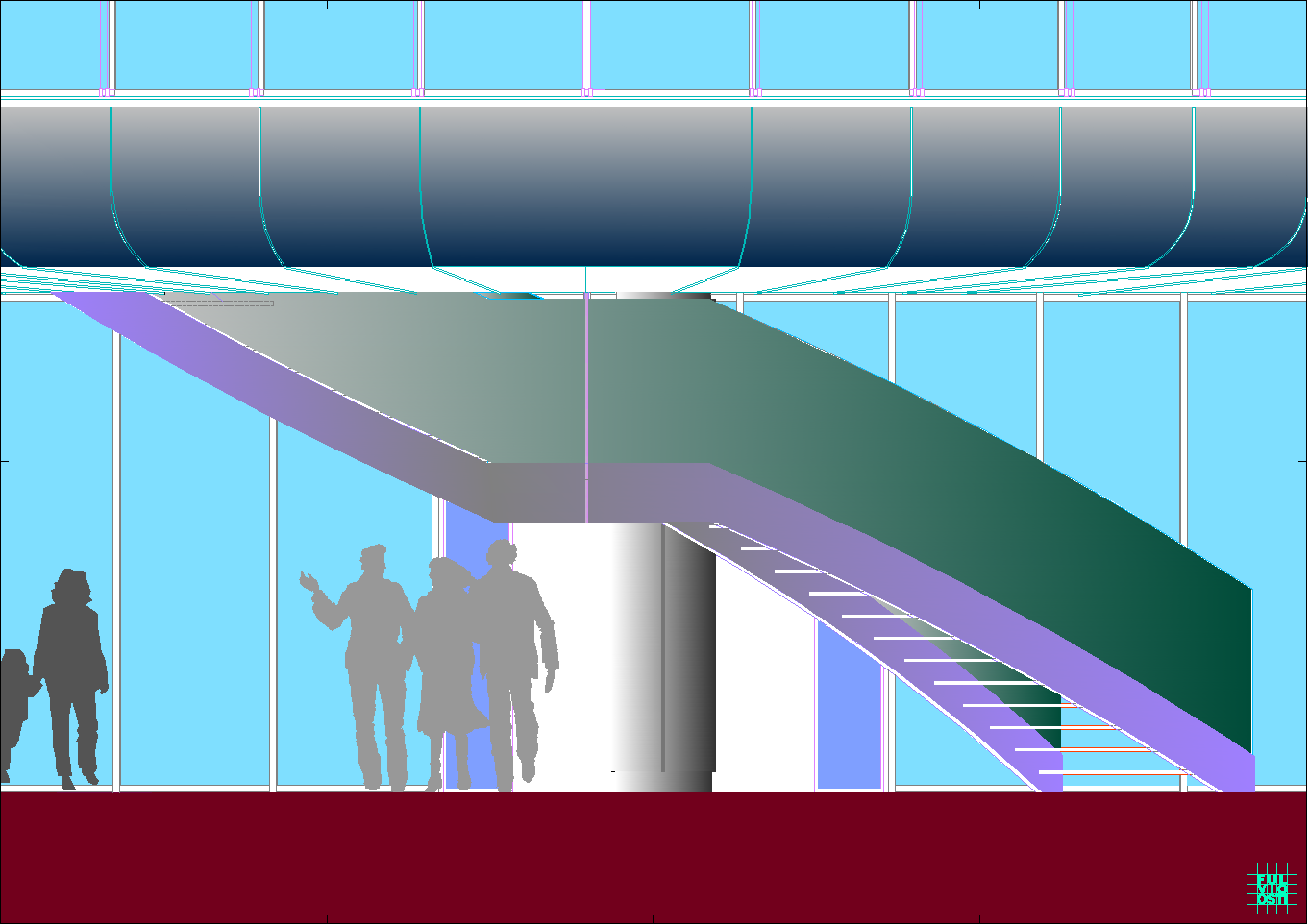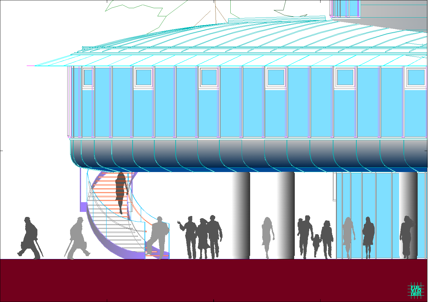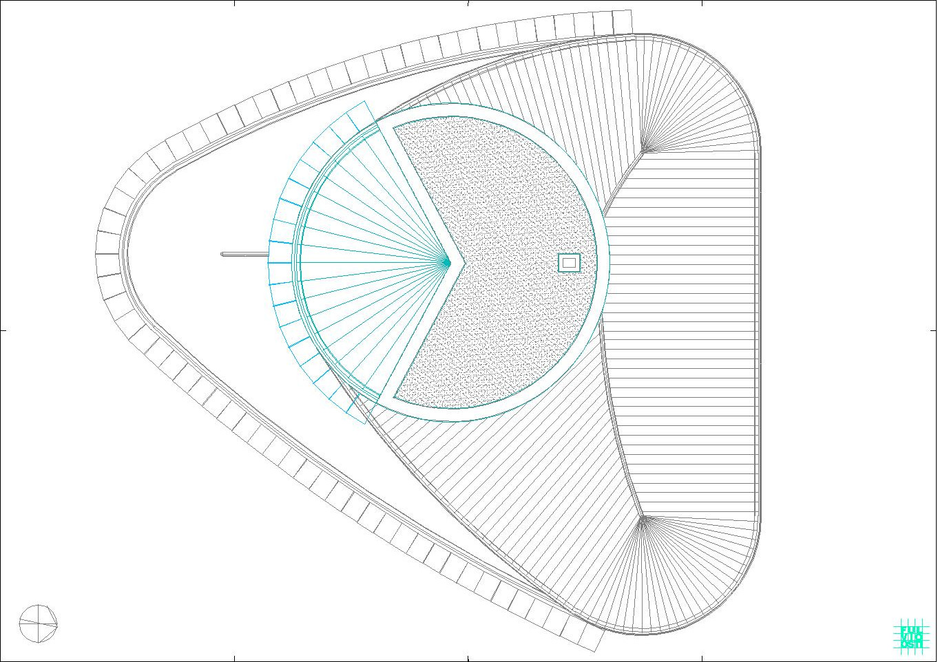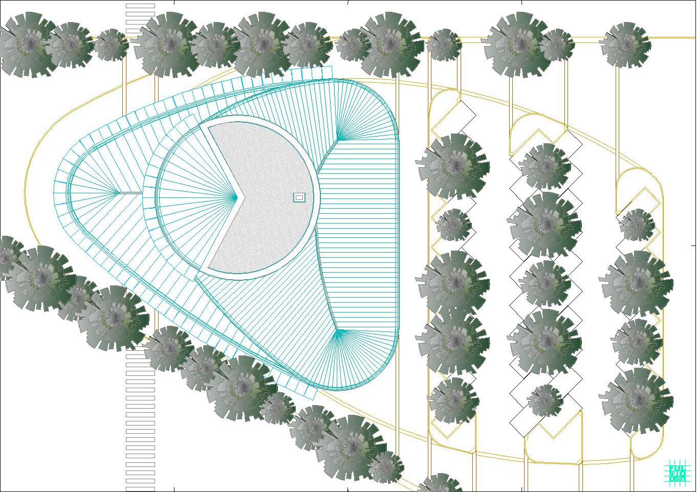 In questa "foresta" di immagini di ogni tipo, il progetto crede di individuare la propria ratio attraverso la lettura del sito, che è poco più di un trapezio allungato. Da questa situazione e da una riflessione sugli elementi ambientali, che sono proibitivi a dir poco, ne esce un modello a fasciature circolari, nell'intenzione di realizzare un involucro a forma "magmatica", come una calza di nylon che avvolge dei dischi circolari.