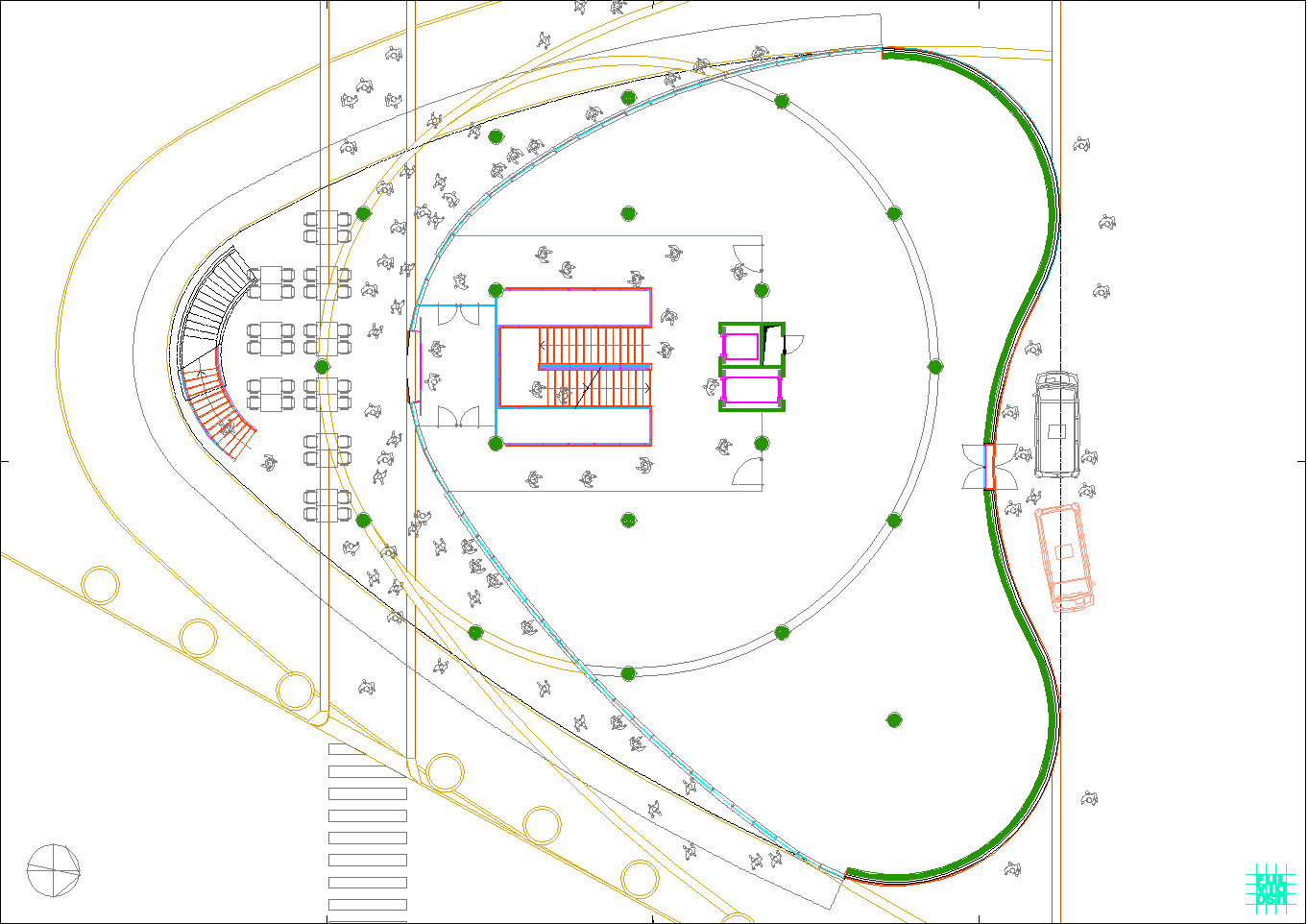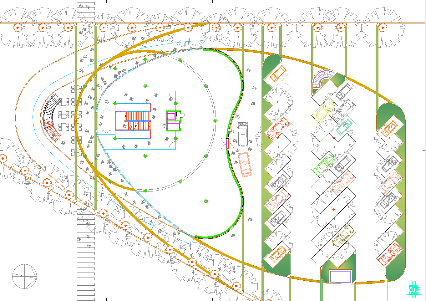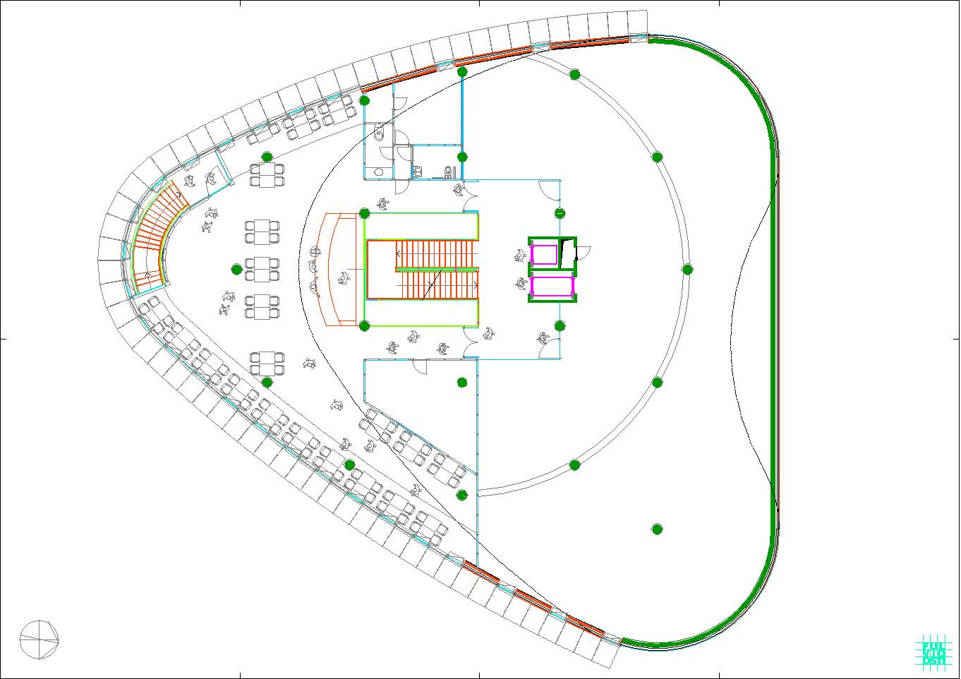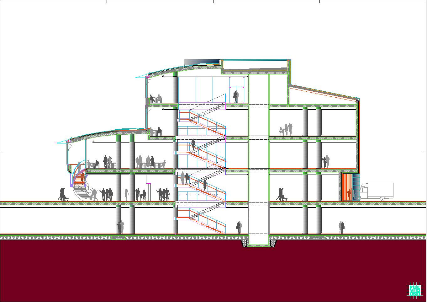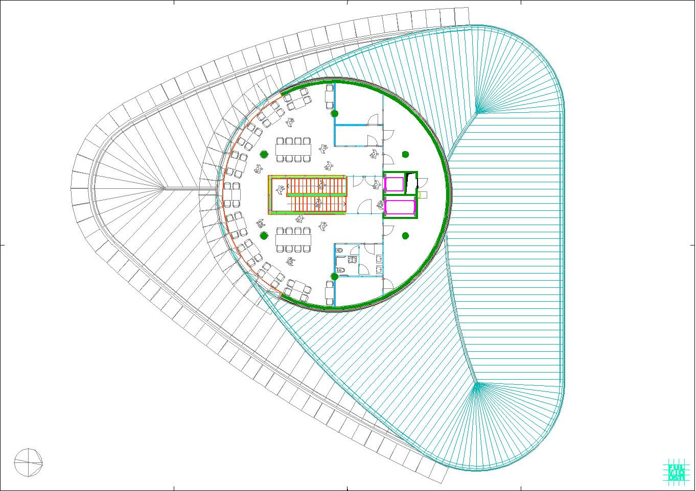 In questa "foresta" di immagini di ogni tipo, il progetto crede di individuare la propria ratio attraverso la lettura del sito, che è poco più di un trapezio allungato. Da questa situazione e da una riflessione sugli elementi ambientali, che sono proibitivi a dir poco, ne esce un modello a fasciature circolari, nell'intenzione di realizzare un involucro a forma "magmatica", come una calza di nylon che avvolge dei dischi circolari.