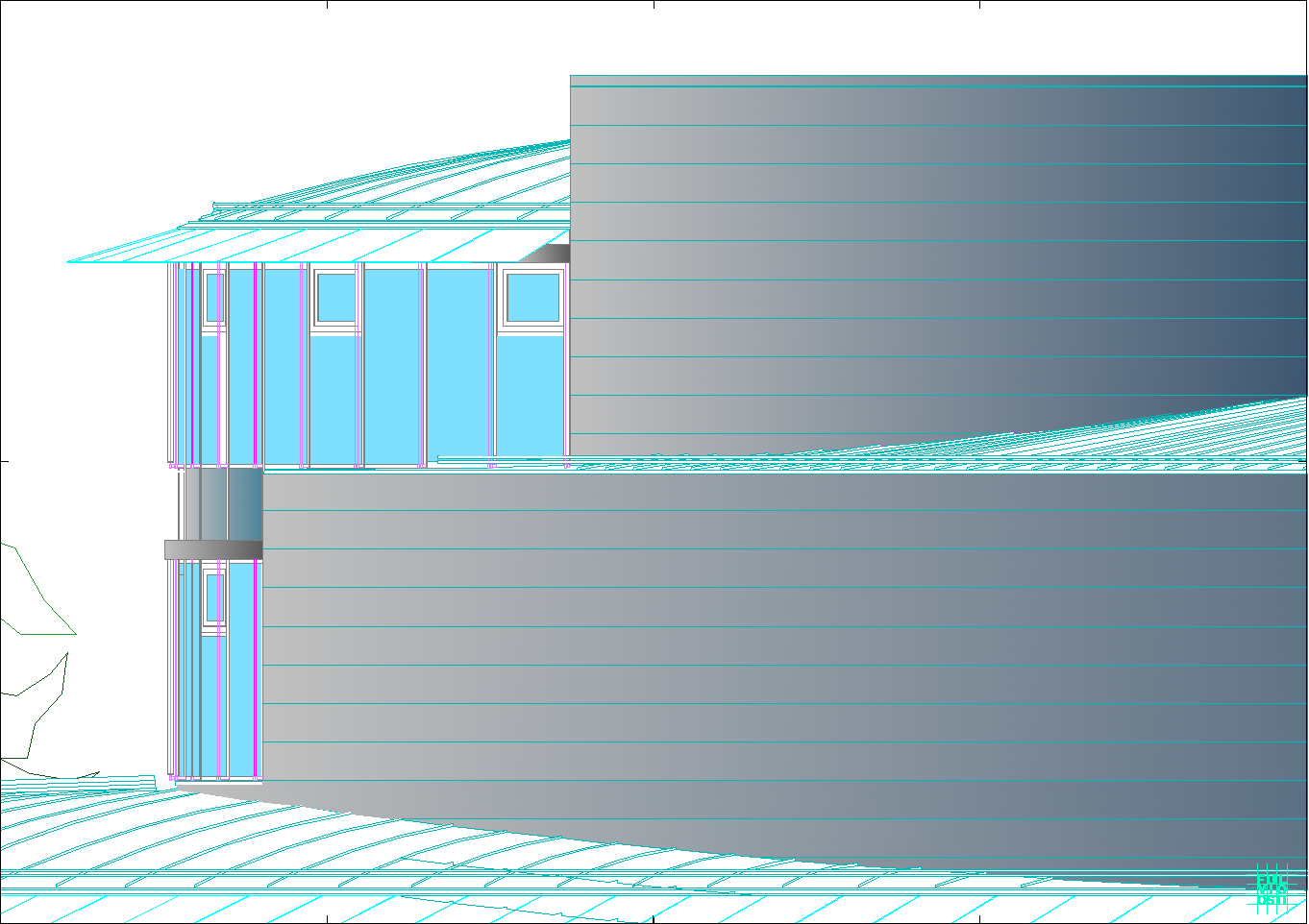 Queste scelte sono rimarcate dall'utilizzo del materiale di rivestimento di facciata, dove prevale il nastro metallico dello zinco al titanio steso orizzontalmente a fasciature continue. Le ampie vetrate verso il sole sono disposte a filo muro, per accentuare l'effetto di continuità delle facciate e di leggerezza dell'insieme,