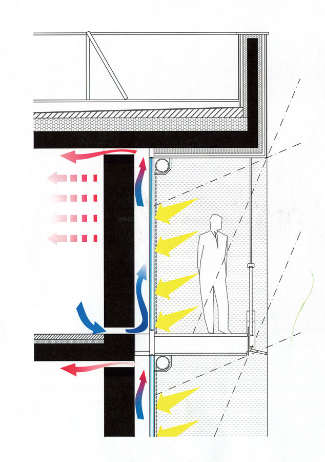 I balconi e gli sporti della copertura dovranno proteggere i piani sottostanti dagli eccessi del soleggiamento estivo. Oltre a una buona protezione termica, dovranno essere dotati di sistemi fotovoltaici e sistemi solari per l’accumulo di energia elettrica e termica che nel presente caso trovano alloggio sul terrazzo praticabile.