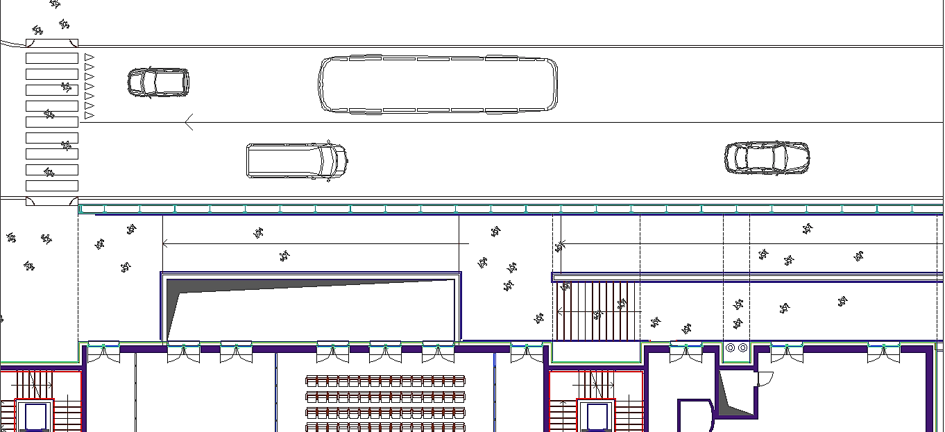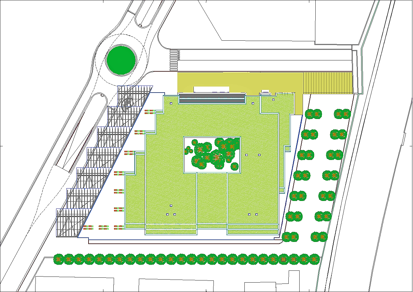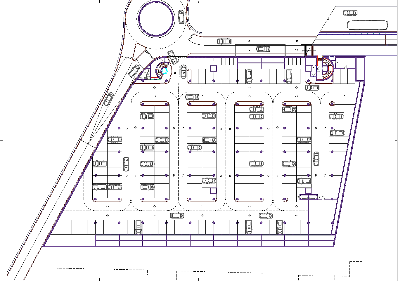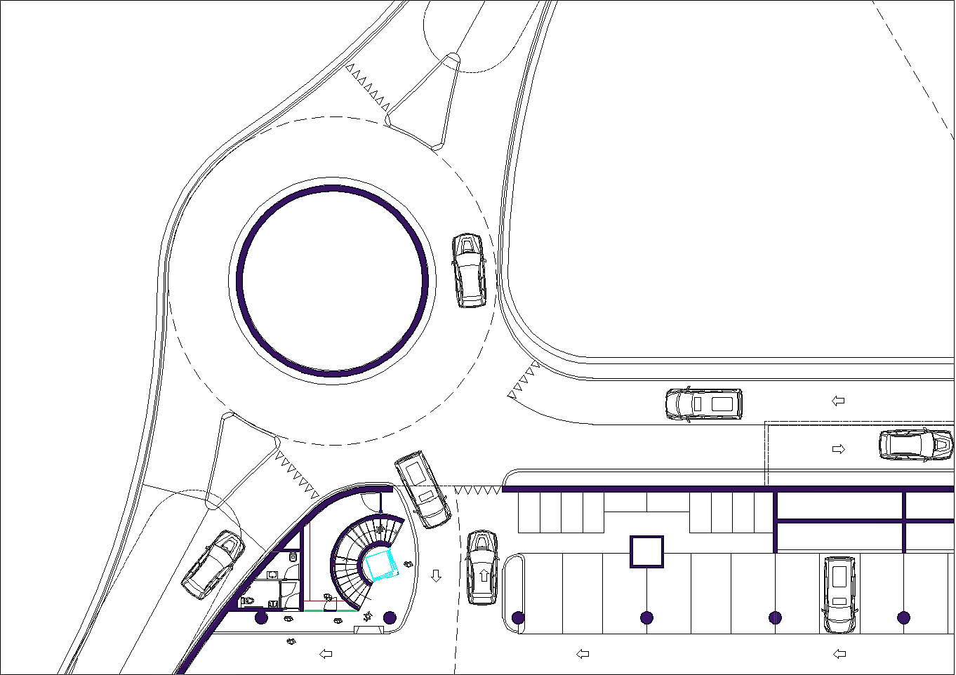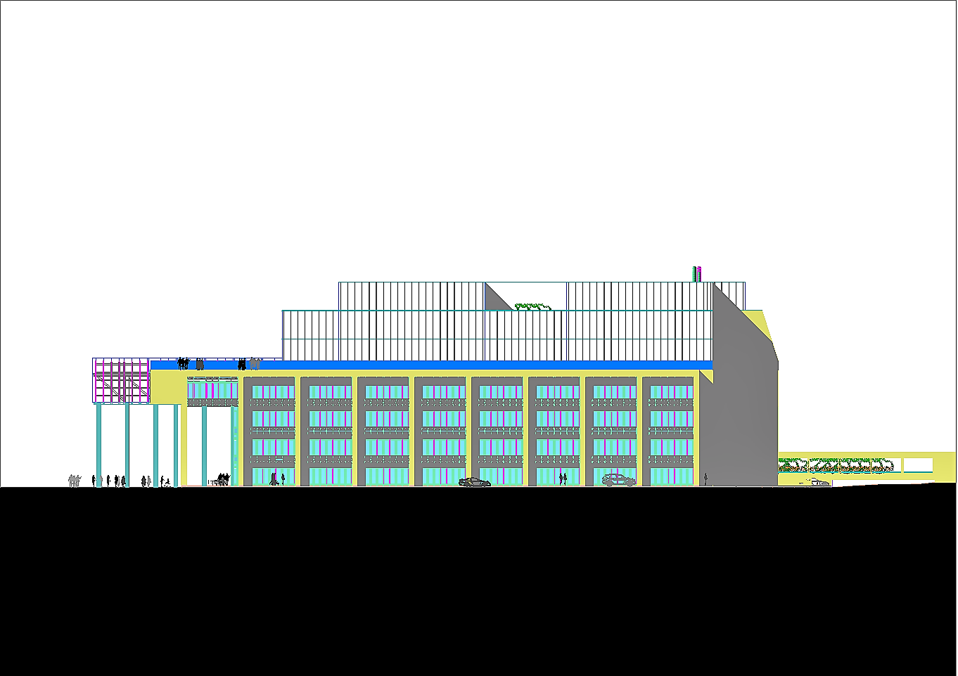 Prima di passare all'illustrazione del progetto bisogna non dimenticare che l'area attuale è adibita ad un importantissimo parcheggio pubblico. Esso è indispensabile a chi, da fuori, voglia entrare nel centro storico. La sua rimozione sarebbe inaccettabile. A tal fine tutta l'istituzione precedentemente descritta riguarda i volumi fuori terra, eccetto le parti relative ai servizi tecnologici. Negli interrati sono stati ricavati tre livelli di parcheggi pubblici completamente autonomi dal resto dell'edificio per complessivi posti auto 453. Si sa già che non sarà possibile realizzare il terzo livello interrato in quanto le falde si trovano a -6.00 metri dalla superficie del terreno calpestabile, pertanto i posti auto disponibili si riducono a 310, che corrispondono alle capacità del parcheggio attuale. A questi posti auto pubblici bisogna aggiungere una cinquantina di posti pertinenziali ricavati nello spazio retrostante al fabbricato. Da non dimenticare un cinquantina di posti al coperto per motociclette ed altrettanti e più per biciclette.