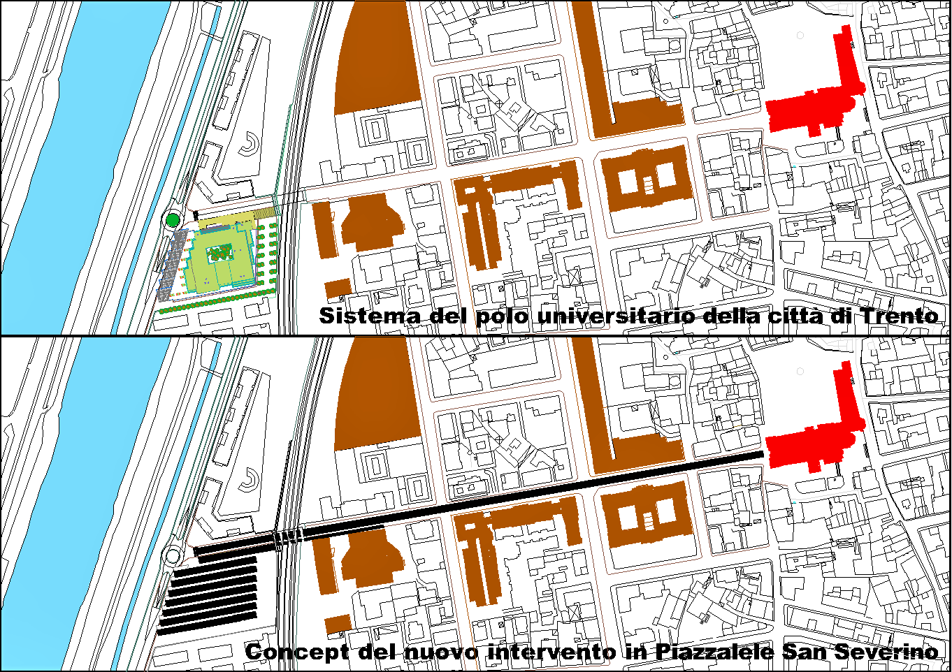 Le tormentate vicende dell'area Piazzale San Severino in Trento offrono l'occasione al progettista di cimentarsi in una sua proposta, cercando di dare una risposta alle potenzialità e difficoltà oggettive del luogo. (ottobre-dicembre 2017)