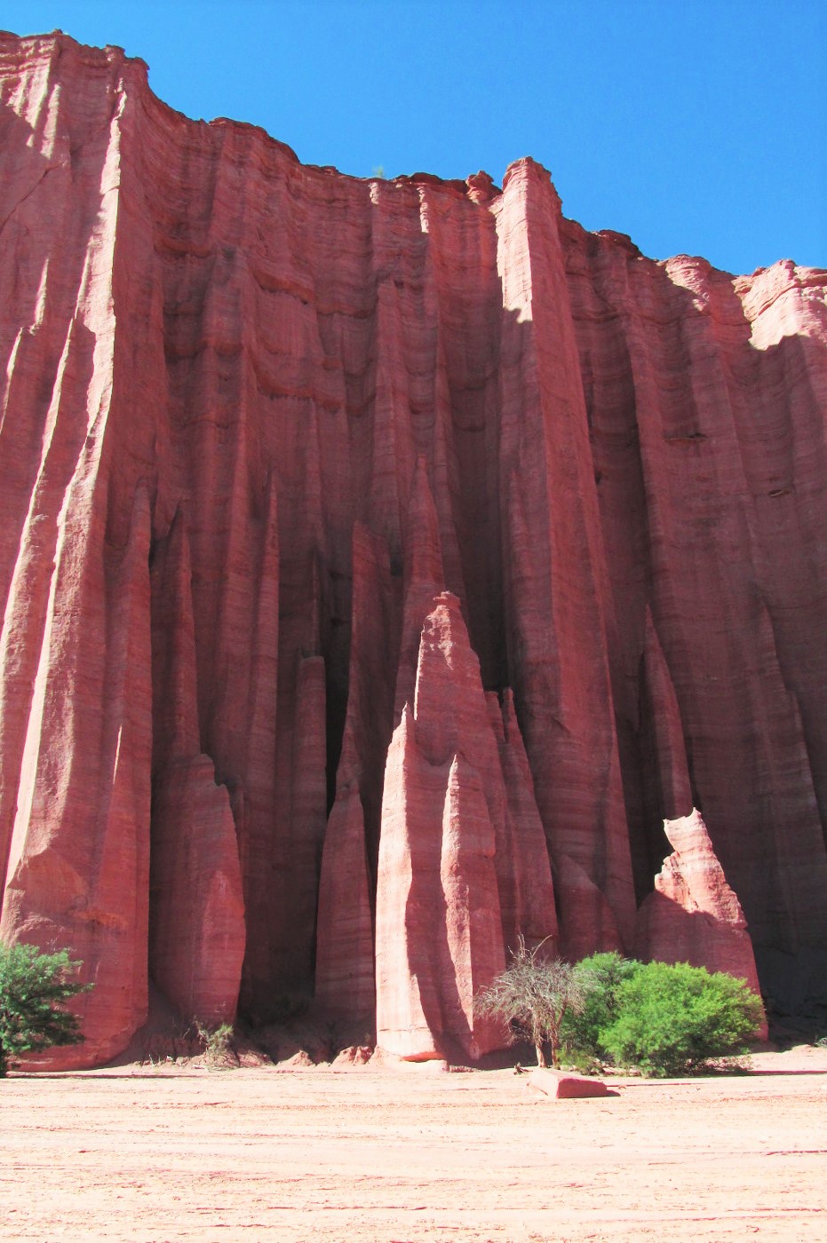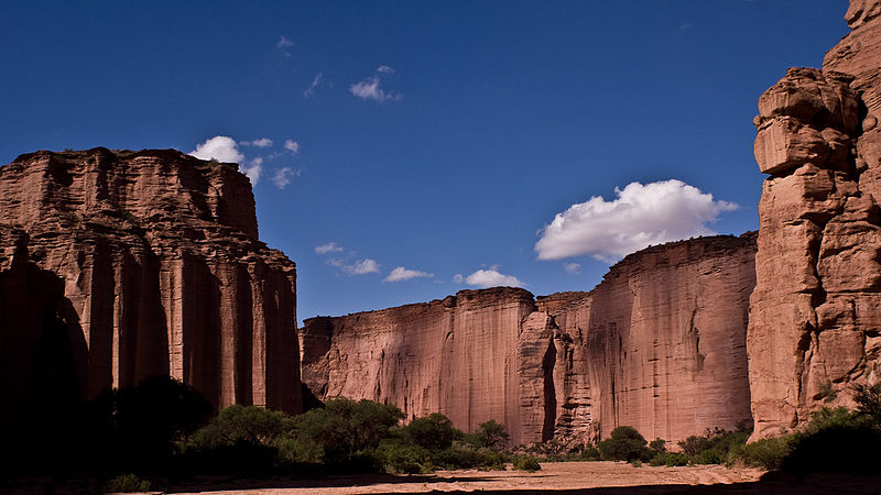 El Parque Nacional de Talampaya, nella provincia argentina di La Rioja nel nord-ovest andino, riserva momenti di grande e drammatica spettacolarità, caratterizzato come è da un grande canyon eroso da un fiume che scende dalle Ande e che lo percorre per decine di chilometri, scavando trincee che arrivano anche a oltre centotrenta metri di altezza in un suolo caratterizzato da arenaria rossa, segno evidente della presenza del minerale ferro che adombra su buona parte della cordillera andina. Queste stratificazioni, più a ovest vicino alla cordillera stessa, trovano degli innalzamenti apocalittici a seguito delle spinte della piattaforma sudamericana che si spinge verso ovest di circa due centimetri all'anno e che hanno portato, attraverso le ere geologiche, all'innalzamento del più esteso sistema montuoso che si conosca. Va detto che anche detti rilievi subiscono tuttora delle spinte in alto nella misura di un centimetro all'anno.
