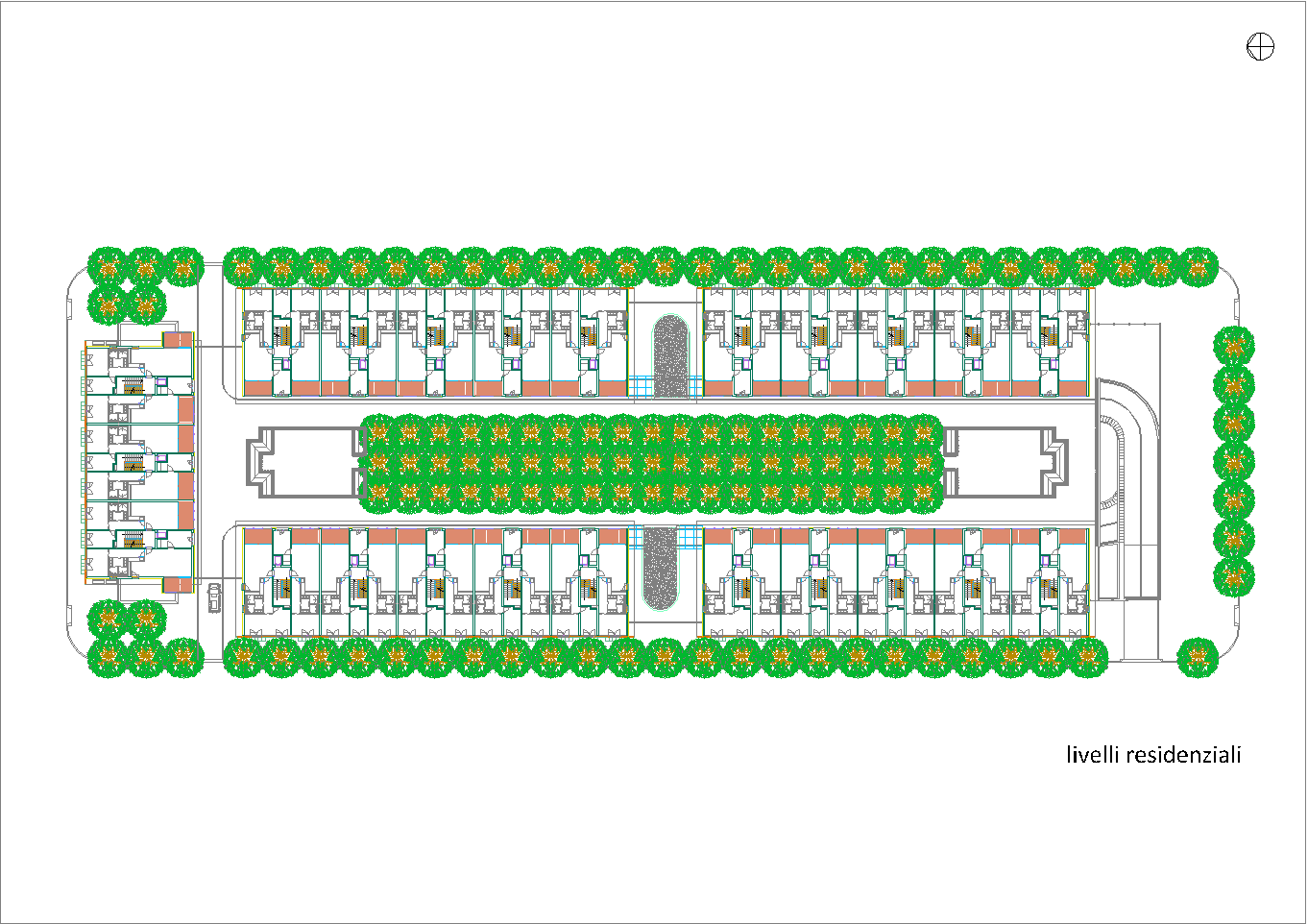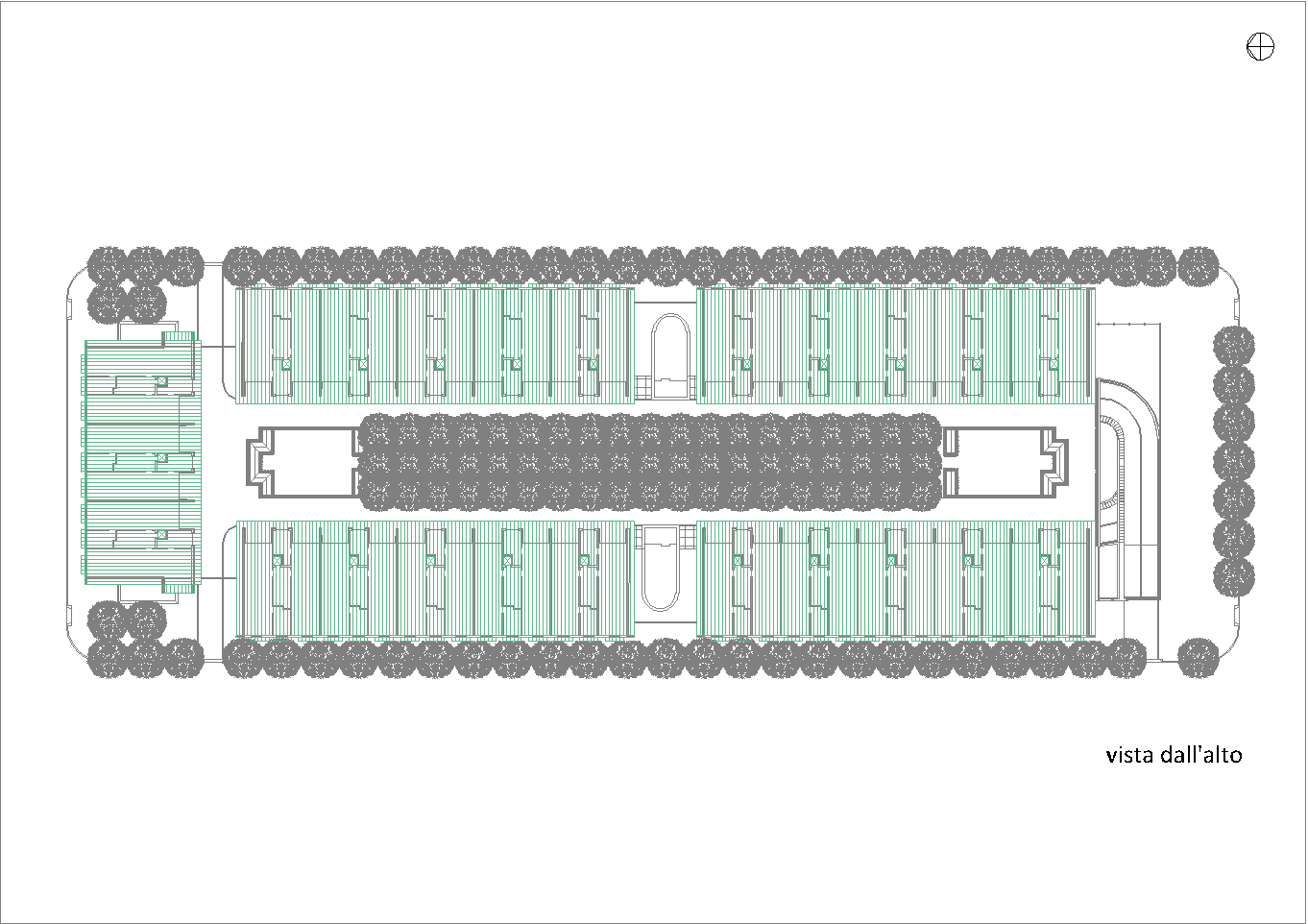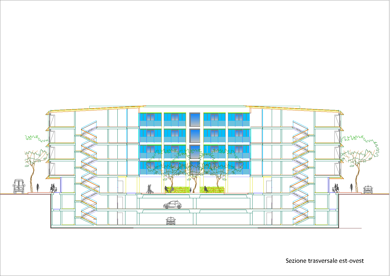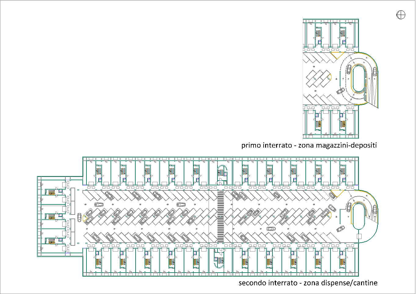 Questo secondo progetto, rispetto al primo, ha la particolarità di avere contenuto la larghezza del cortile-giardino interno alla stretta misura dello spazio necessario per alloggiare una doppia spina di automobili nei parcheggi dei piani interrati. (Settembre 2020-Gennaio 2021)