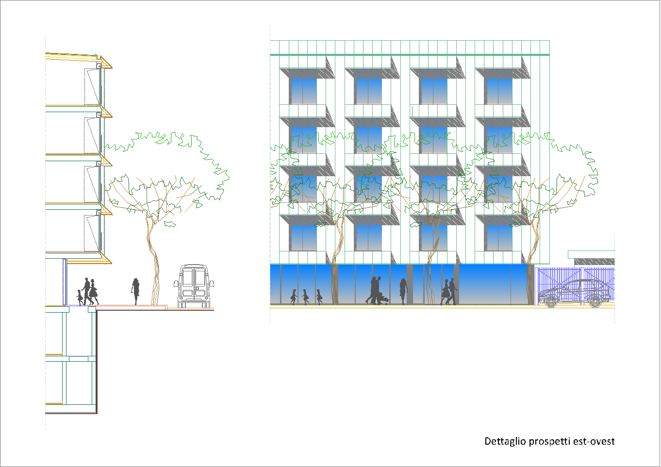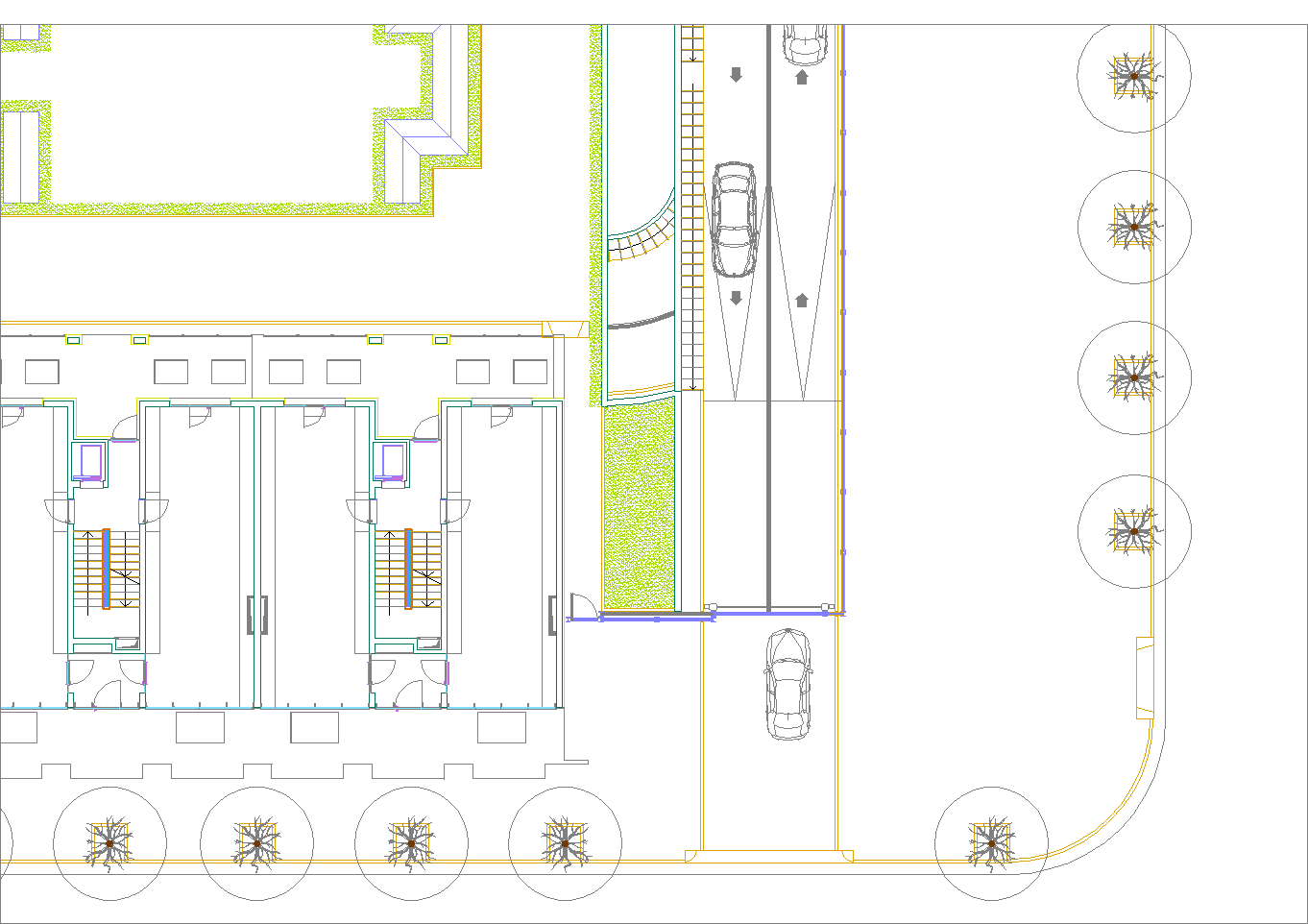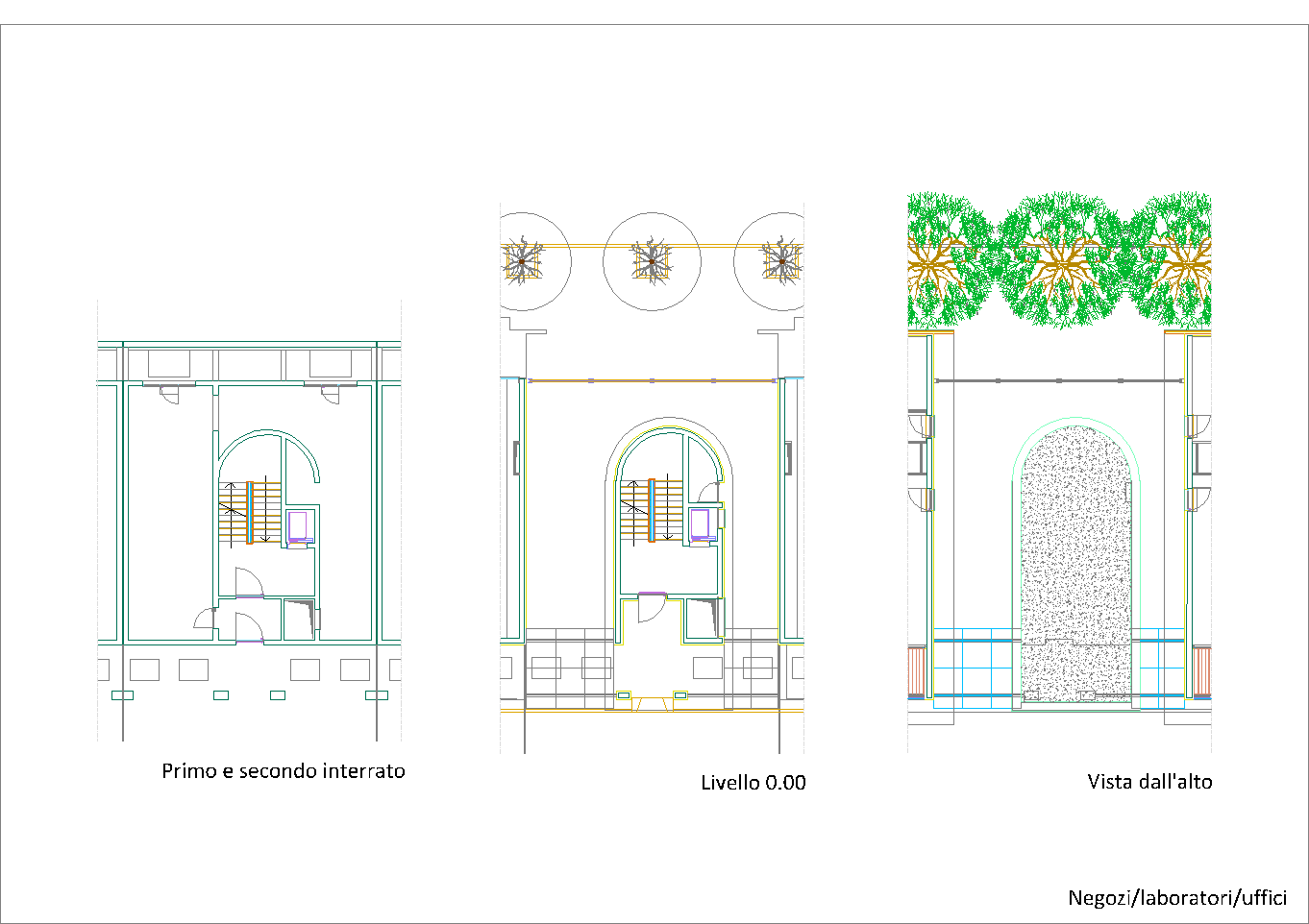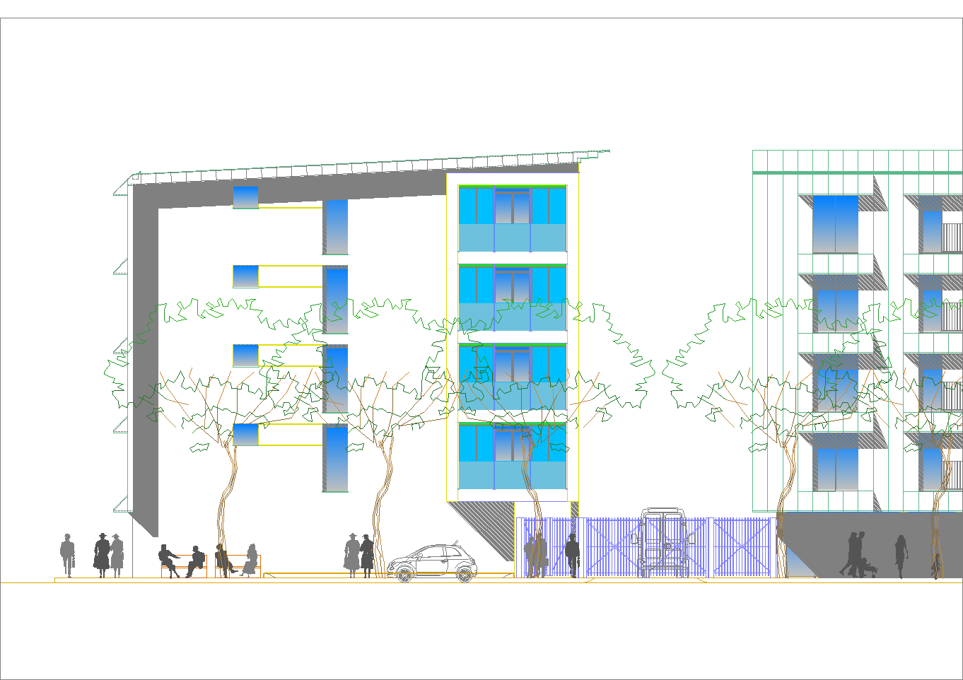 Questo secondo progetto, rispetto al primo, ha la particolarità di avere contenuto la larghezza del cortile-giardino interno alla stretta misura dello spazio necessario per alloggiare una doppia spina di automobili nei parcheggi dei piani interrati. (Settembre 2020-Gennaio 2021)