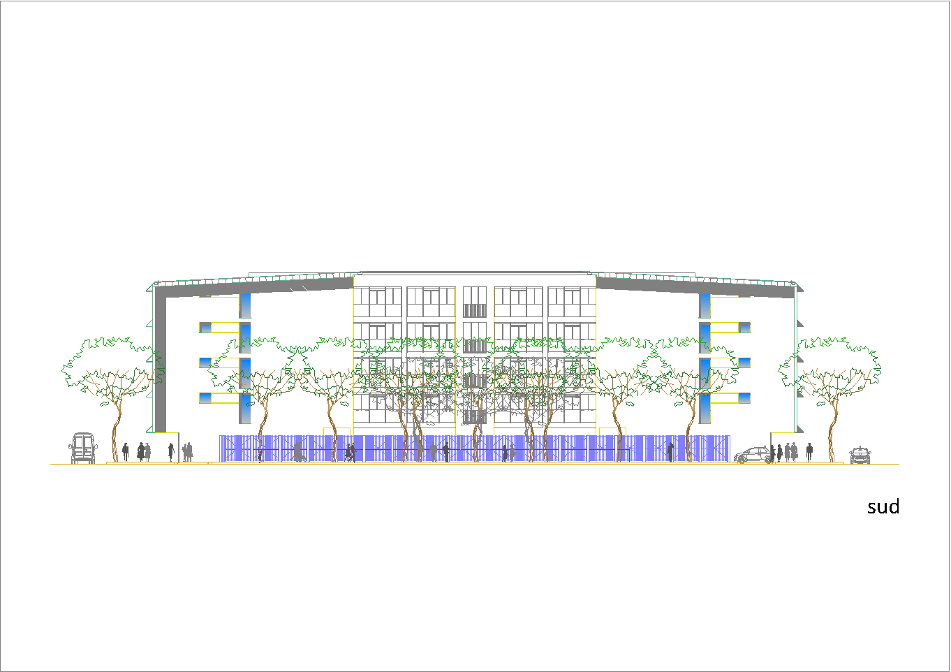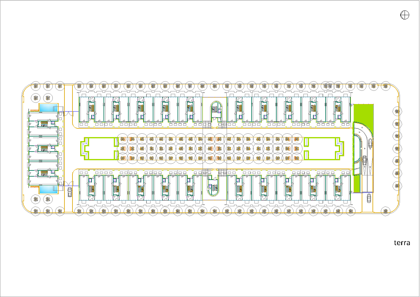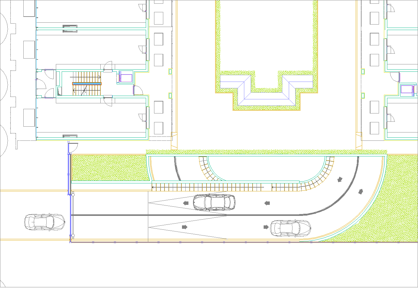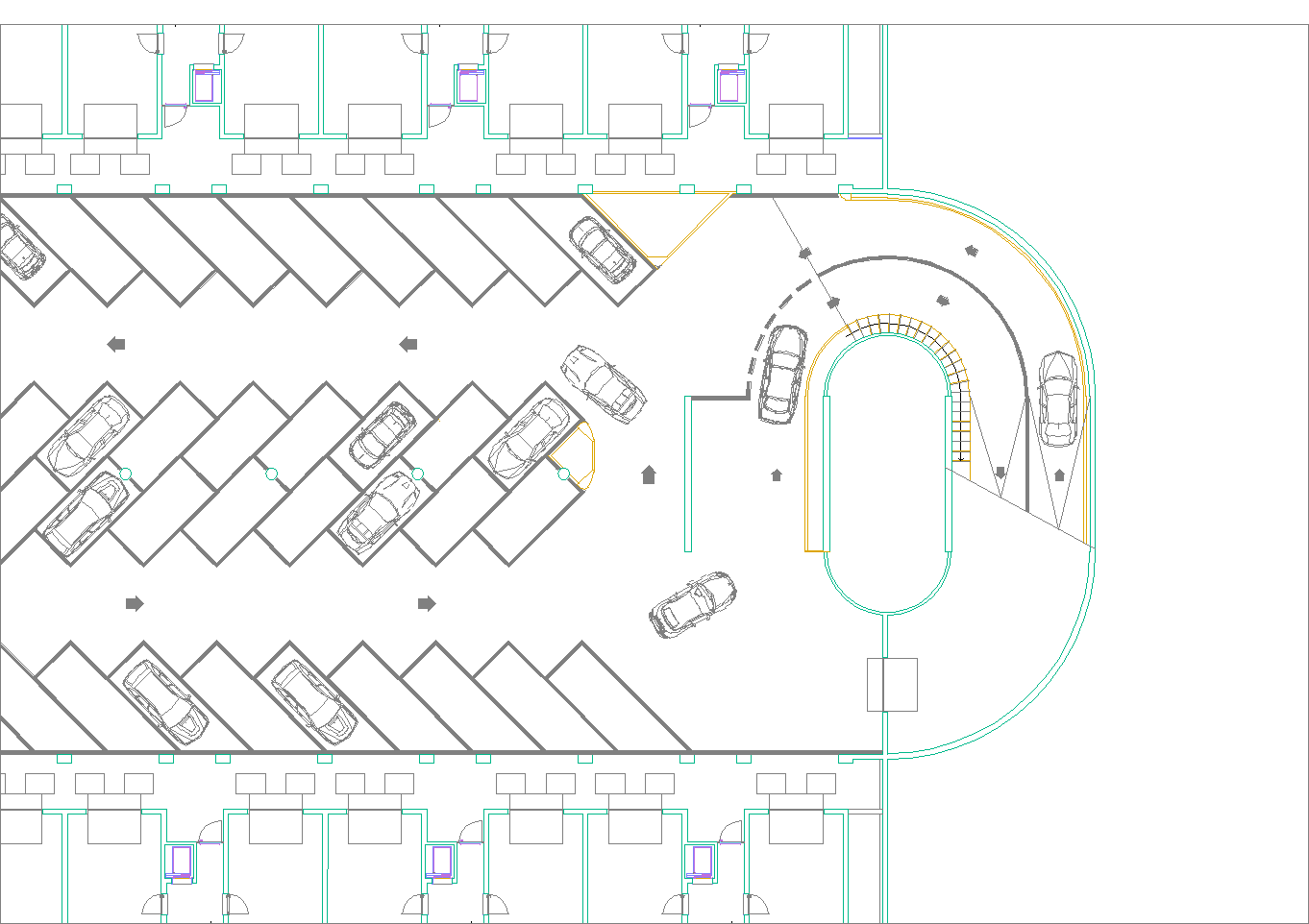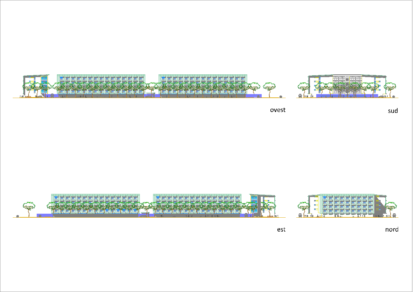 Questo secondo progetto, rispetto al primo, ha la particolarità di avere contenuto la larghezza del cortile-giardino interno alla stretta misura dello spazio necessario per alloggiare una doppia spina di automobili nei parcheggi dei piani interrati. (Settembre 2020-Gennaio 2021)