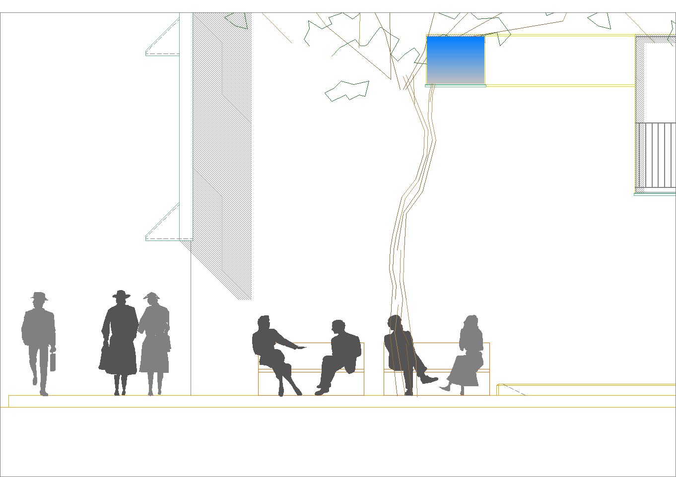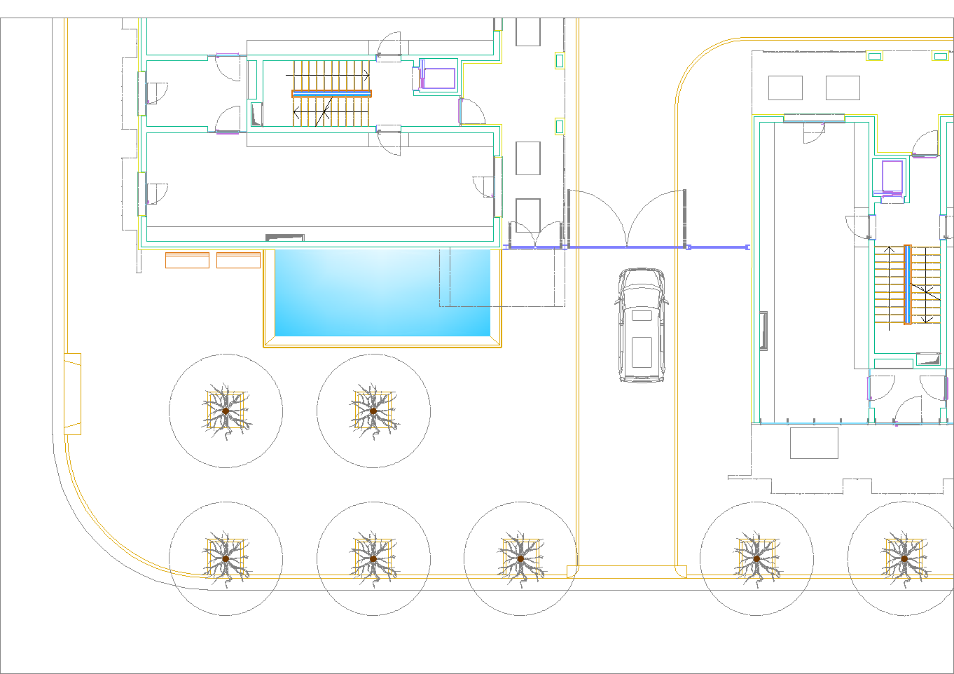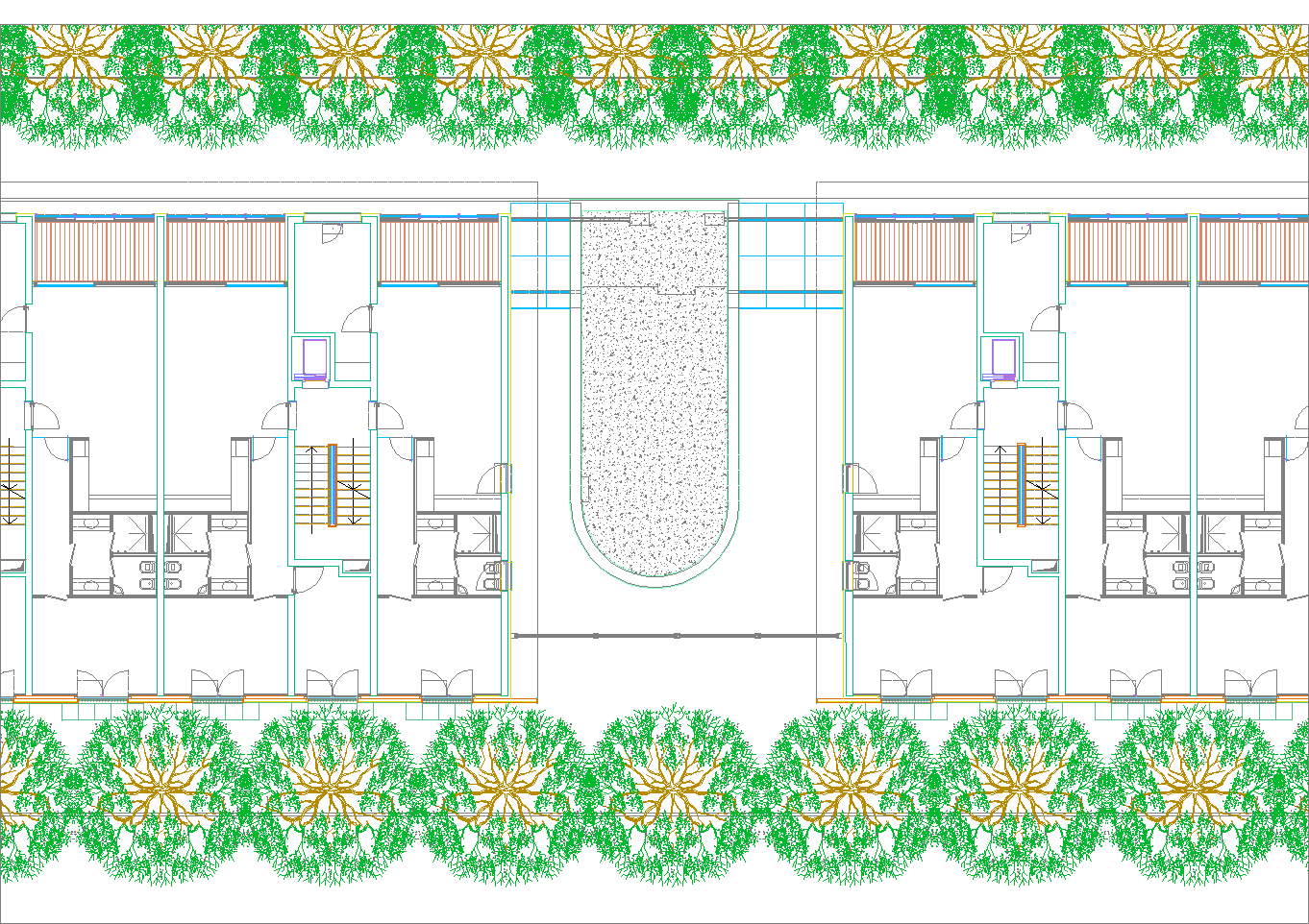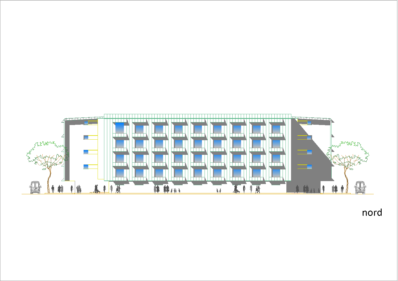 Questo secondo progetto, rispetto al primo, ha la particolarità di avere contenuto la larghezza del cortile-giardino interno alla stretta misura dello spazio necessario per alloggiare una doppia spina di automobili nei parcheggi dei piani interrati. (Settembre 2020-Gennaio 2021)