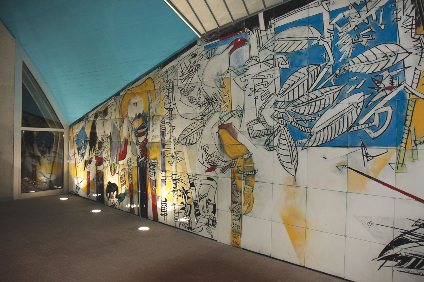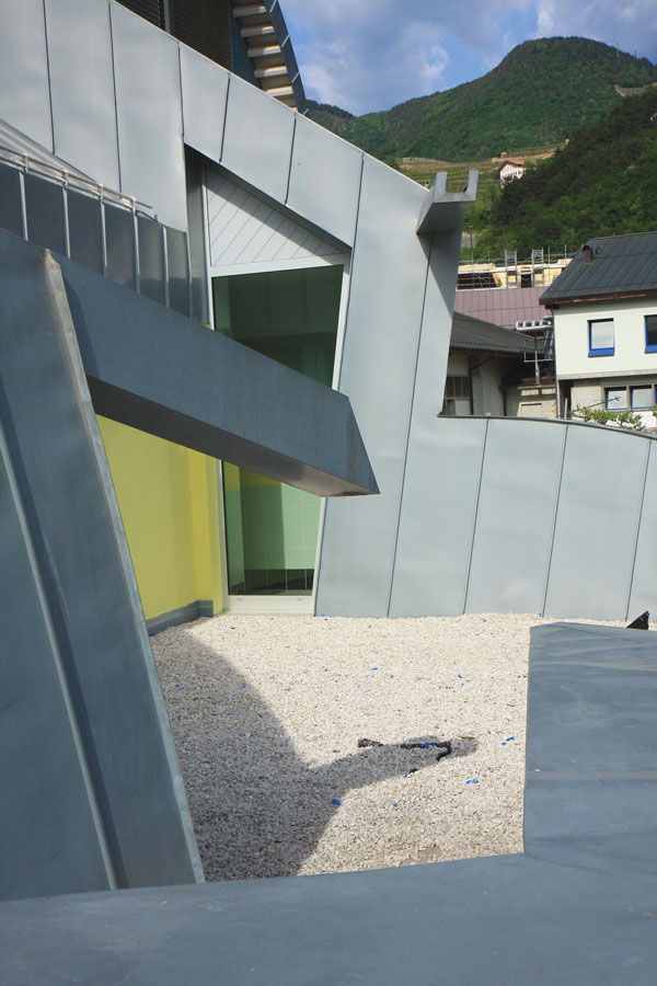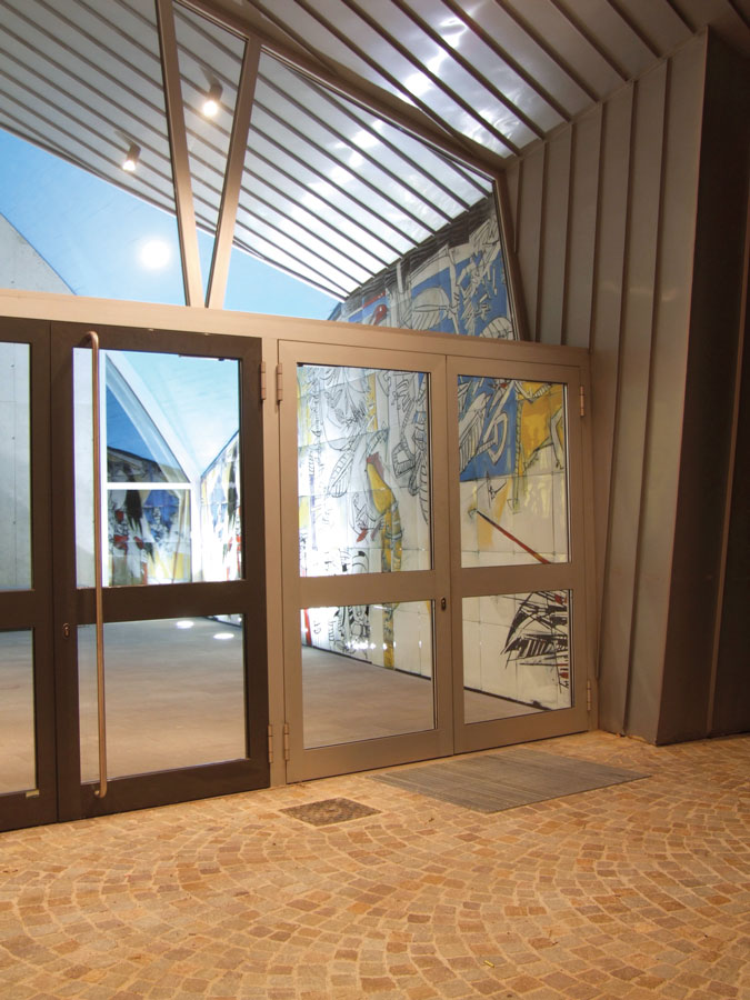 La disarmonia delle parti fortemente disarticolate nelle forme, nella tessitura dei materiali e nei colori è tenuta assieme dal tema dominante della grande sala: inevitabile elemento coagulante della metafora di un mondo che stenta a ritrovarsi nell’unità.