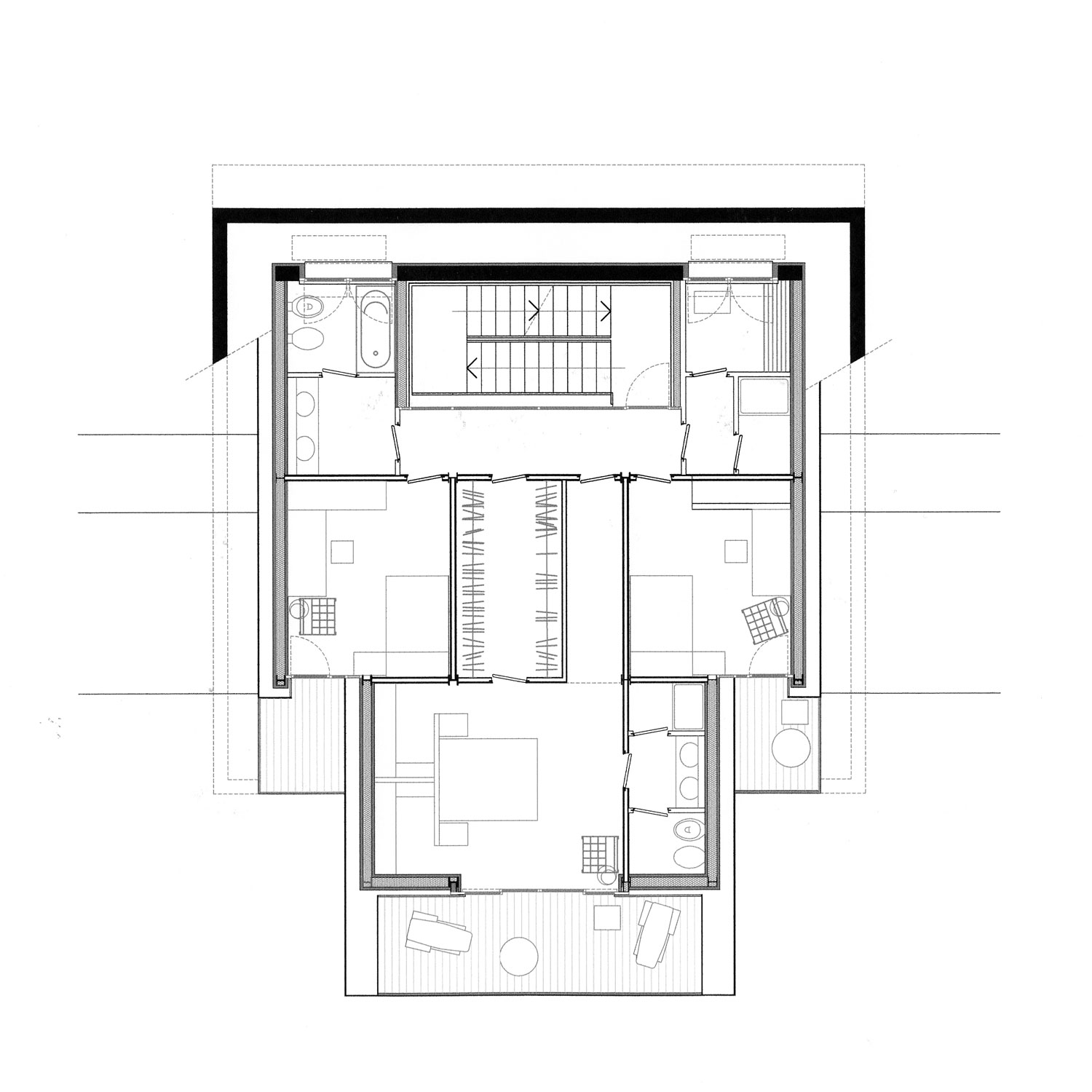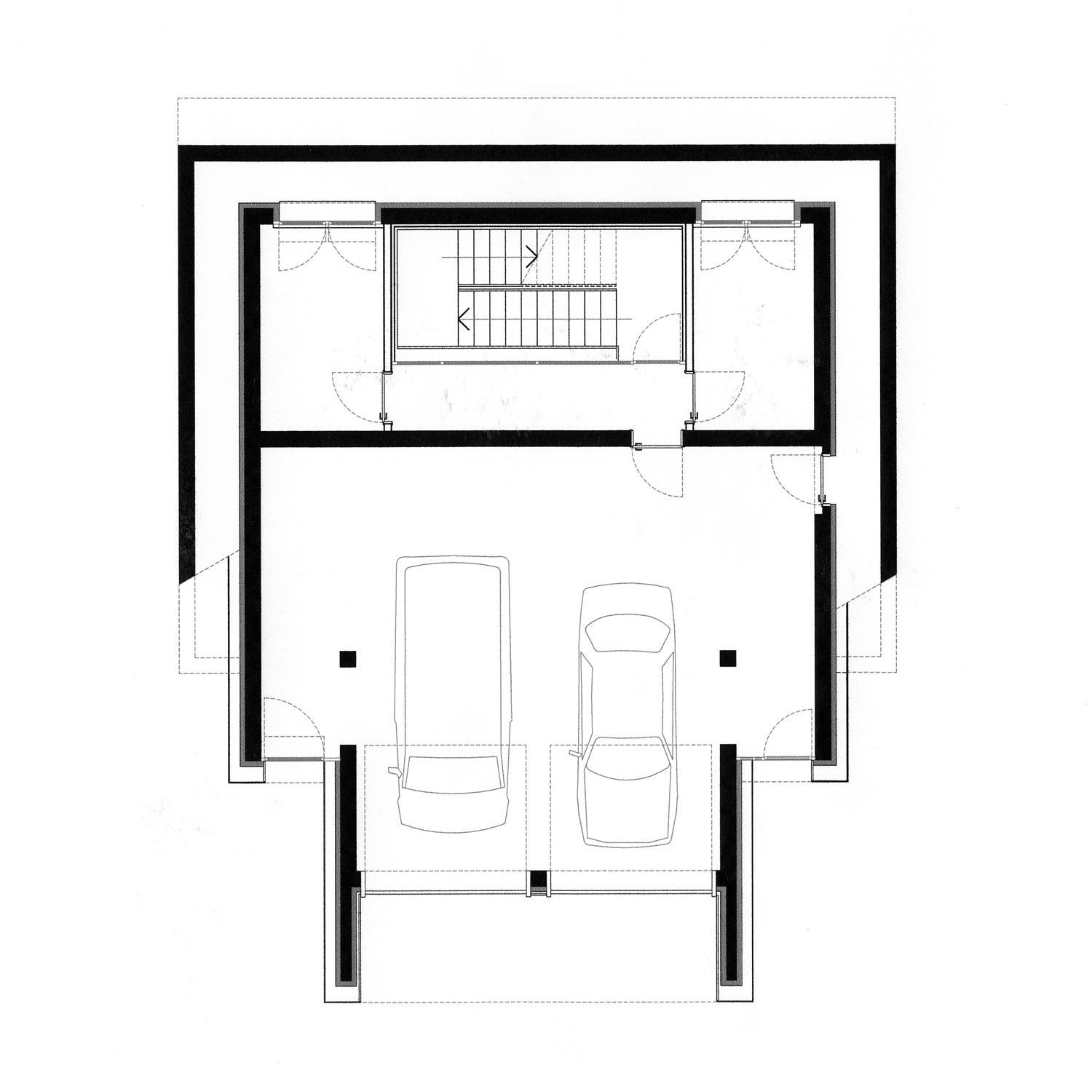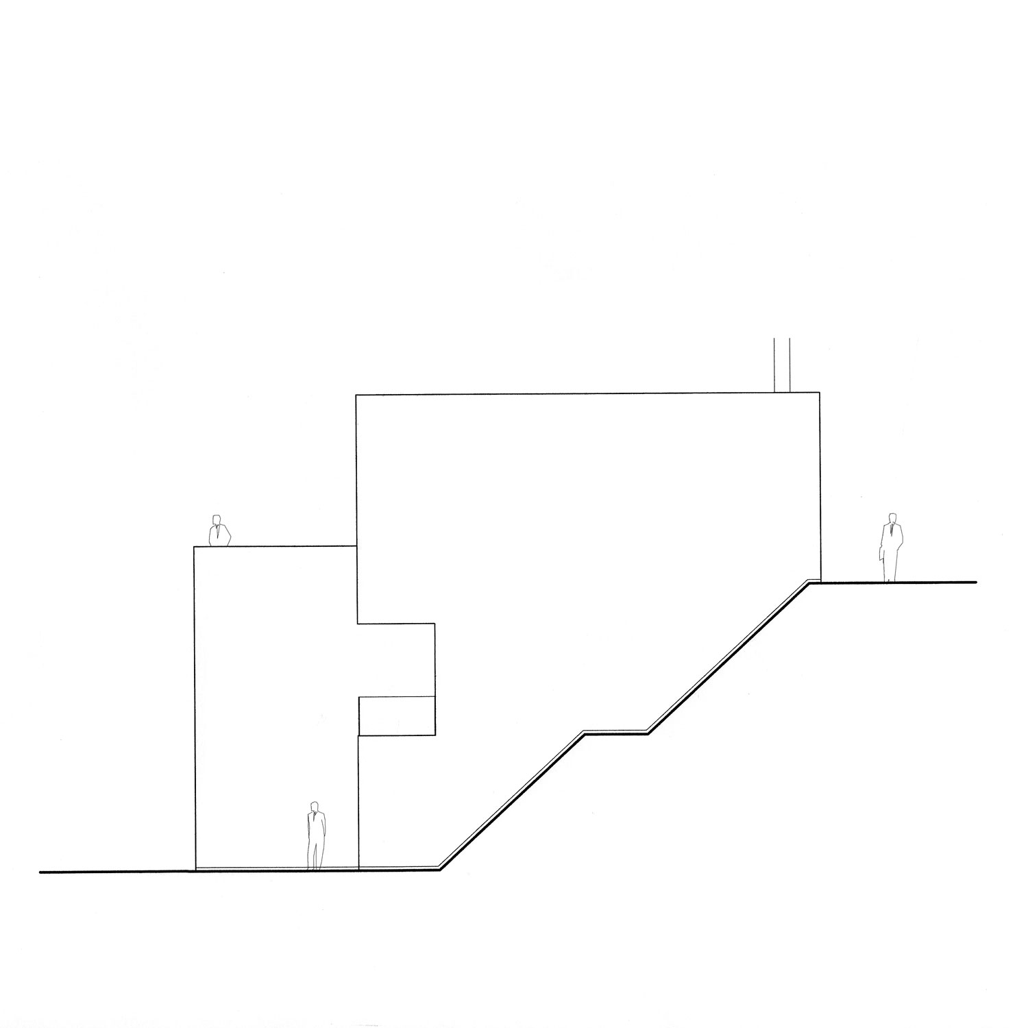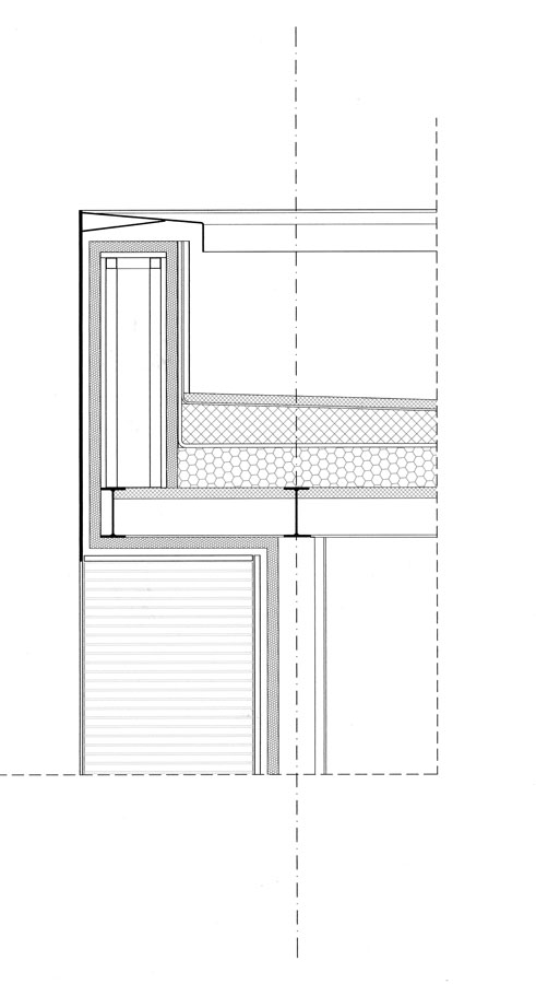 L’alloggio a due livelli di vita si dispone su un forte pendio e si caratterizza come un gioco di slittamento di scatole incastrate. L’accesso dall’alto comporta un rovesciamento delle consuete disposizioni: in alto la zona giorno e in basso le stanze. Anche qui, come nei casi precedenti, le parti abitabili sono verso il sole, mentre gli spazi di servizio vengono relegati a nord.