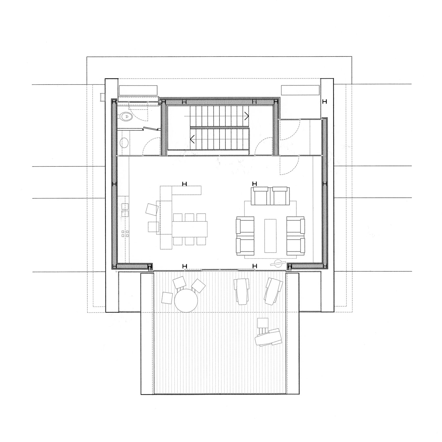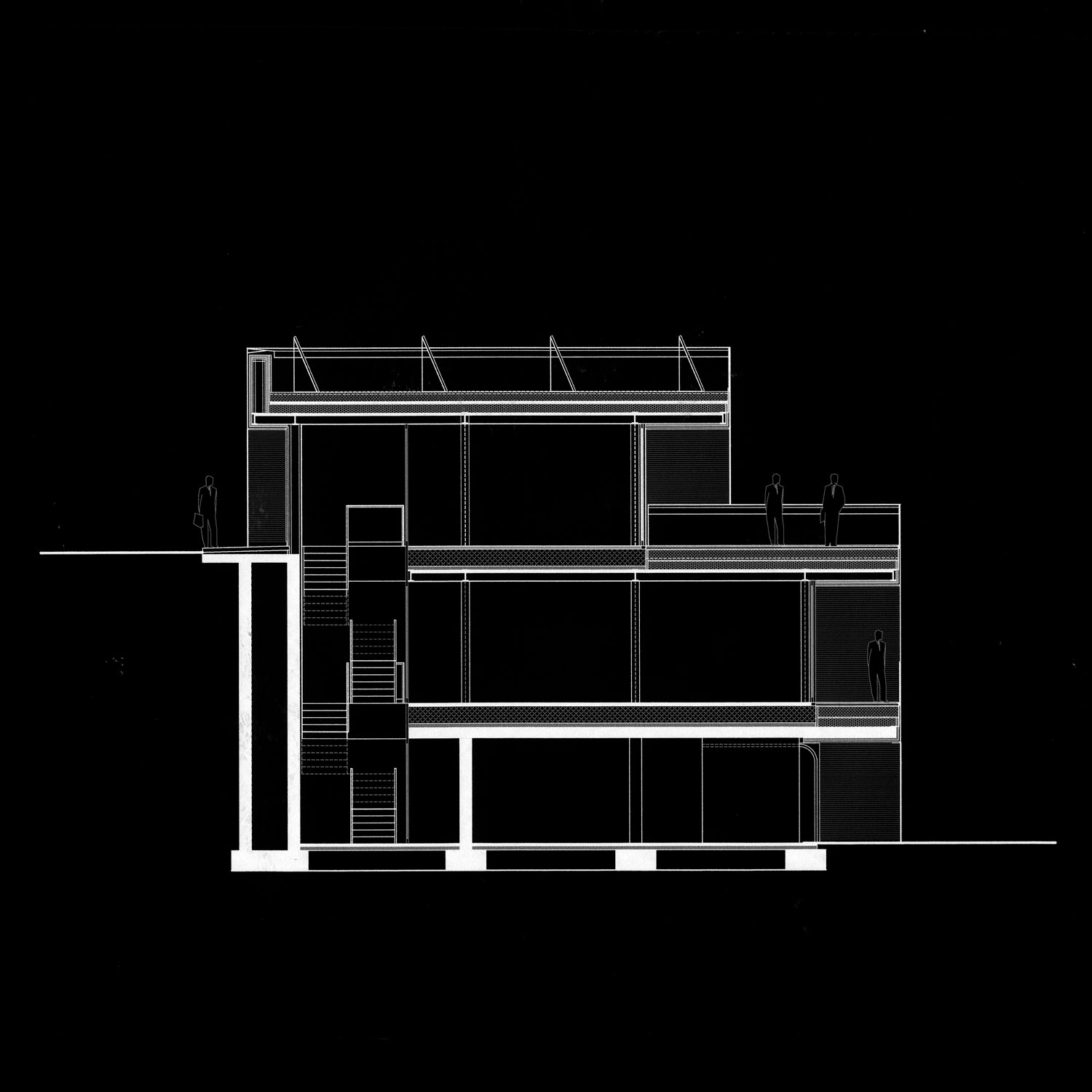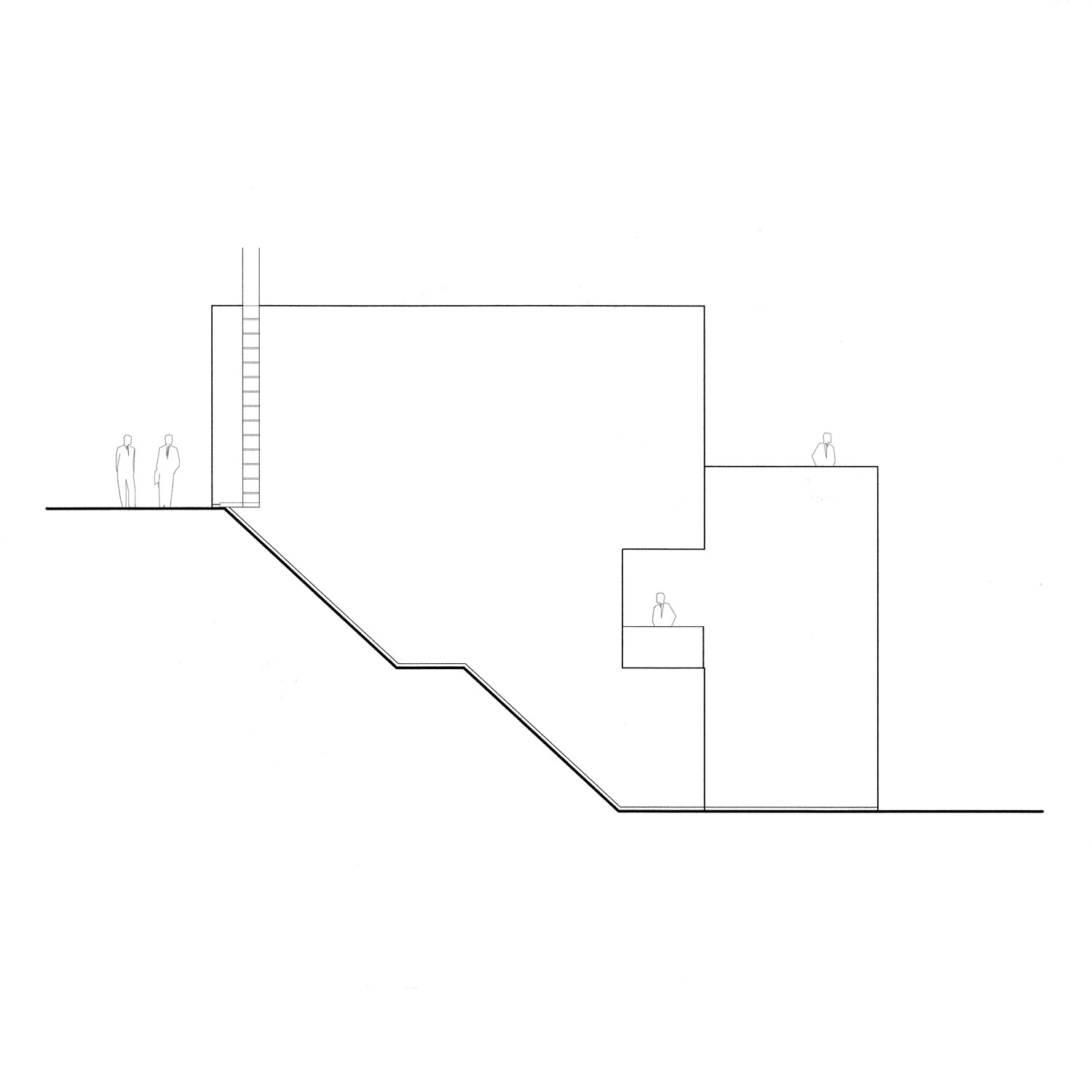 L’alloggio a due livelli di vita si dispone su un forte pendio e si caratterizza come un gioco di slittamento di scatole incastrate. L’accesso dall’alto comporta un rovesciamento delle consuete disposizioni: in alto la zona giorno e in basso le stanze. Anche qui, come nei casi precedenti, le parti abitabili sono verso il sole, mentre gli spazi di servizio vengono relegati a nord.